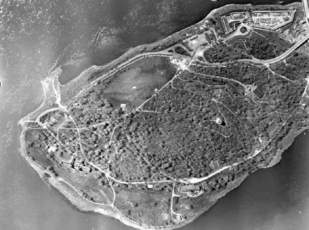 В бежевой форме, с оранжевой мишенью на спине, заключенные работают в саду на острове Ронд. В 1940–1943 годах Монреаль был домом для военнопленных с острова Сент-Элен, а также гражданских, присланных Великобританией. Музей Стюарта рассказывает историю того времени, когда он был известен как «Лагерь S/43», в форме игры-бегства.