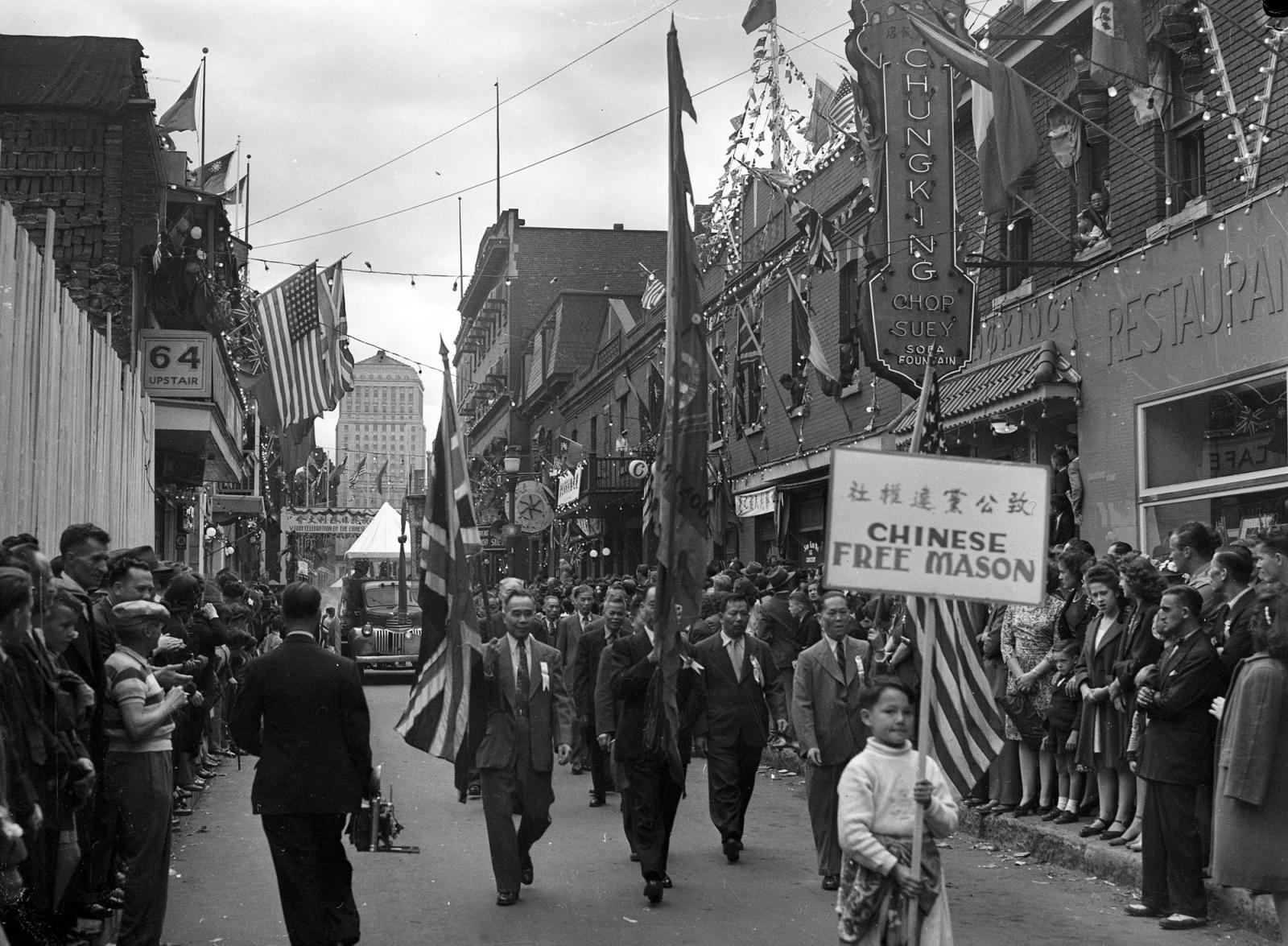 В 1945 году китайцы Монреаля организовали большой парад в честь окончания войны. На живописные и масштабные гуляния пригласили все население города. 2 сентября парад Победы прошел на западной улице де ла Гошетьер в Китайском квартале.