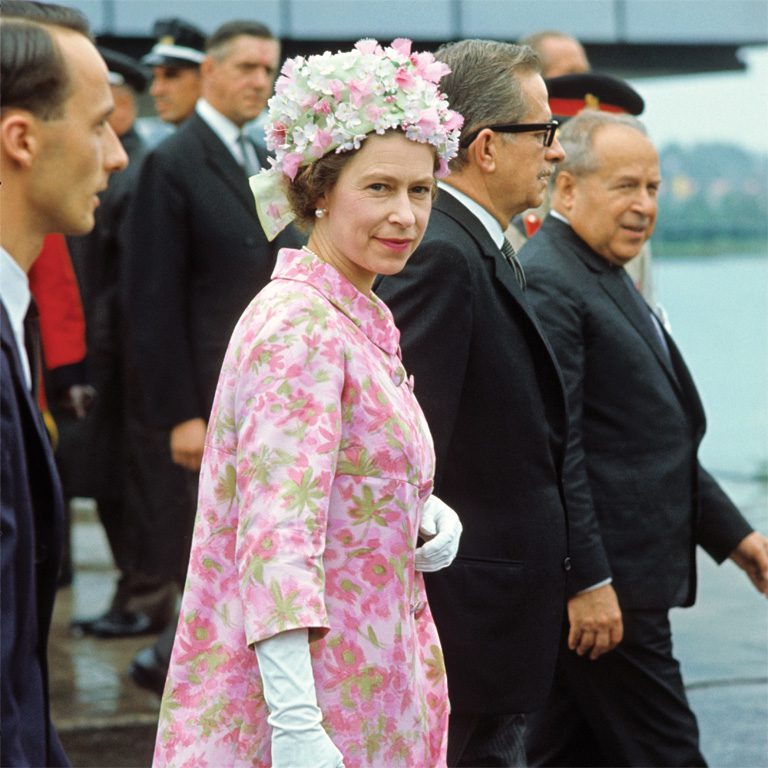Появление Елизаветы II, как и положено королеве, было очень эффектным. Вместе с мужем Филиппом она прибыла на остров Святой Елены рекой Святого Лаврентия на яхте «Британия». В тот день было дождливо, однако у королевы было хорошее солнечное настроение. Она была одета в розовый плащ с красными розами, розово-красно-зеленая цветочную шляпу, белые перчатки, белые туфли на высоком каблуке. Шею украшало двуниточное колье с жемчугом.